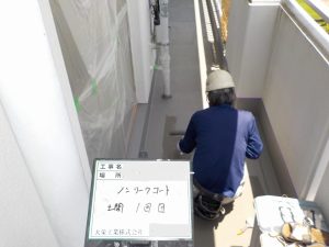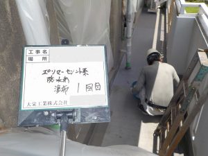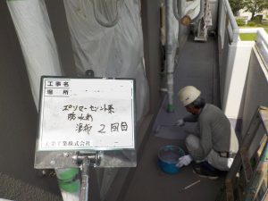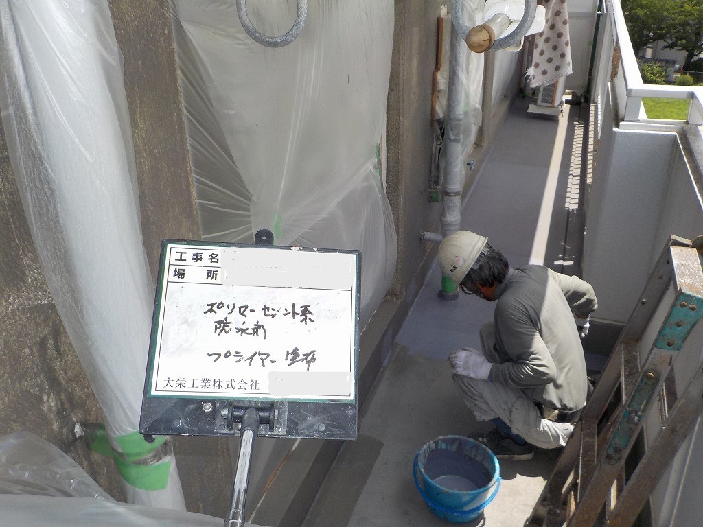 今回はポリマーセメント系防水材を使用しました。液だれしにくく下地のコンクリートがぼこぼこしていても使えて、臭いも少ないのが特徴です。
