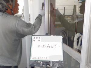 その後、ガラスや壁にしっかり養生をしてから掃除をして下地のプライマー塗りに取り掛かります。